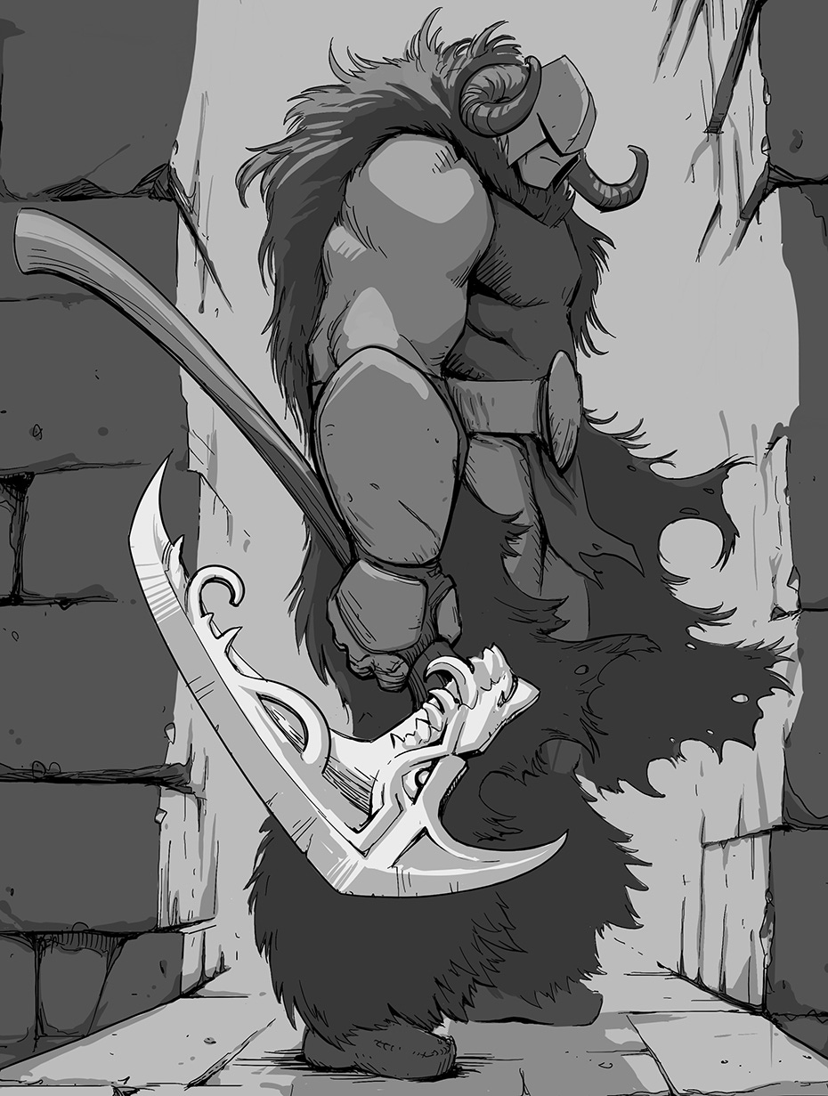 It is a terrifying axe - and it’s really fun to draw! - but it’s not without beauty. Something in its moon-like luminance - so at odds with the rest of this hairy minotaur of a man - has always felt like a hidden promise of nobility. It is the axe of a villain, yes… but so too could it be the axe of a hero.